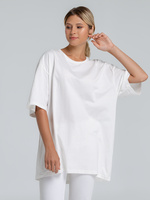 Футболка унисекс со спущенным плечом и круглым вырезом, отделанным резинкой.